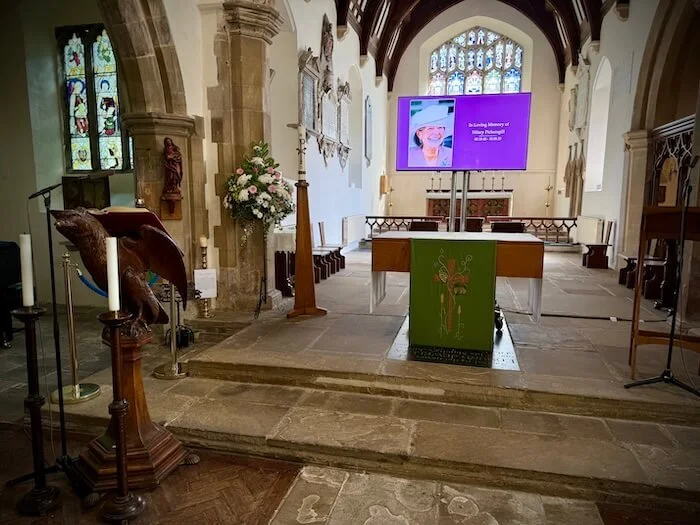 In cases where the funeral service is large and takes place across multiple locations—such as a ceremony inside the church and an overspill outside or in a nearby hall—we offer live TV solutions that provide a continuous feed to various areas. This way, everyone can experience the service in real-time, ensuring that no one feels disconnected from the proceedings.